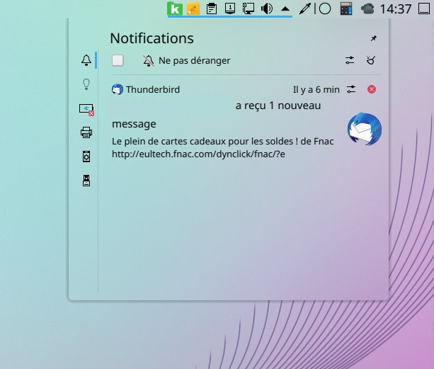 Dans KDE, non, justement, quand je diminue Thunderbird, il se réduit dans le tableau de bord, mais pas dans la barre de tâche, et, je n'ai pas de notification ....