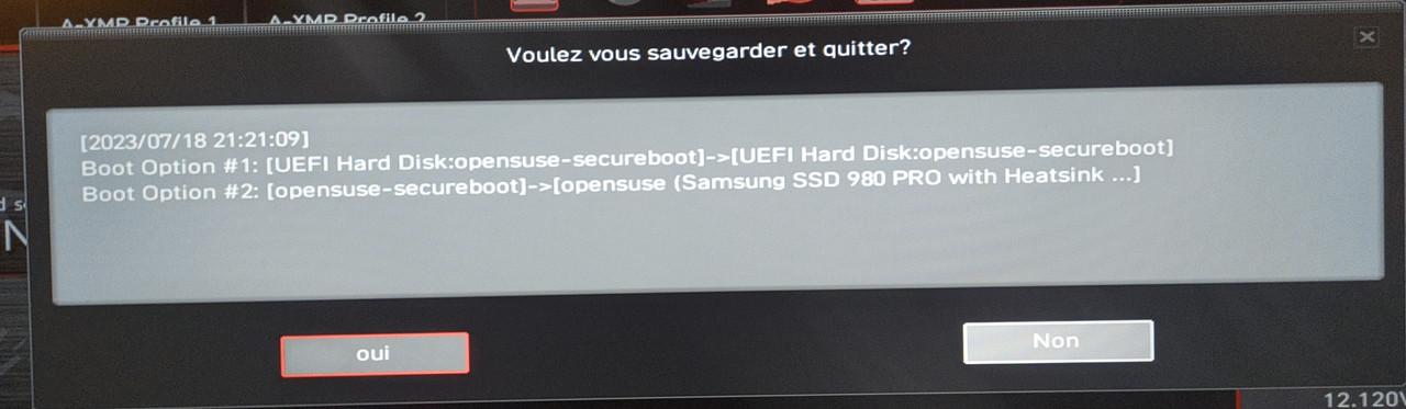 J'ai mis "[UEFI Hard Disk:opensuse-secureboot] en premier et [opensuse (SamsungSSD 980 PRO with Heatsink ...] en 2è comme on le voit sur cette photo :