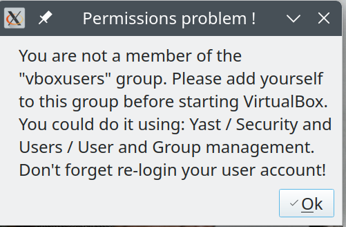 Re : nitrux ; où ça se télécharge, l'iso ??? Répondre #20 – 16 Août, 2025, 17:48:06 Ce n'est pas compliqué à résoudre : avec Yast>Gestion des groupes et utilisateurs. En principe votre login apparaît surligné en bleu, vous cliquez sur modifier puis "détails". Dans la colonne de droite figurent les groupes supplémentaires.Il suffit de cocher toutes les cases qui concernent virtualbox puis ok. Il suffit ensuite de redémarrer le pc. Citer la sélection 1 J'aime