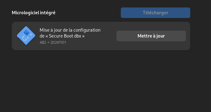 mise a jour la configuration de secure boot dbx 01 Septembre, 2025, 20:30:34 salut à tous!!cette mise a jour ne veut pas se faire!! c'est une mise à jour importante? https://i.postimg.cc/sxnjpJx5/Capture-d-cran-du-2025-09-01-20-26-57.pngj'ai le soucis que sur le Acer. Citer la sélection Dernière édition : 01 Septembre, 2025, 20:40:30 par pépé